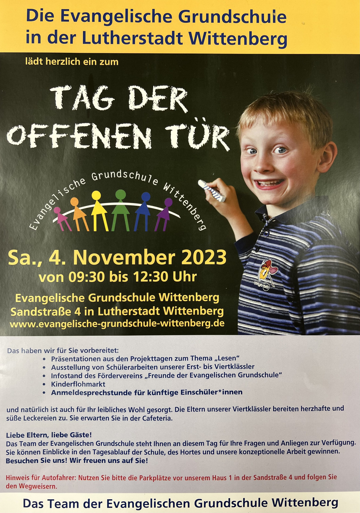 Am 4. November laden wir, die Evangelische Grundschule Wittenberg, ganz herzlich von 9.30 Uhr bis 12.30 Uhr zu unserem Tag der offenen Tür ein.