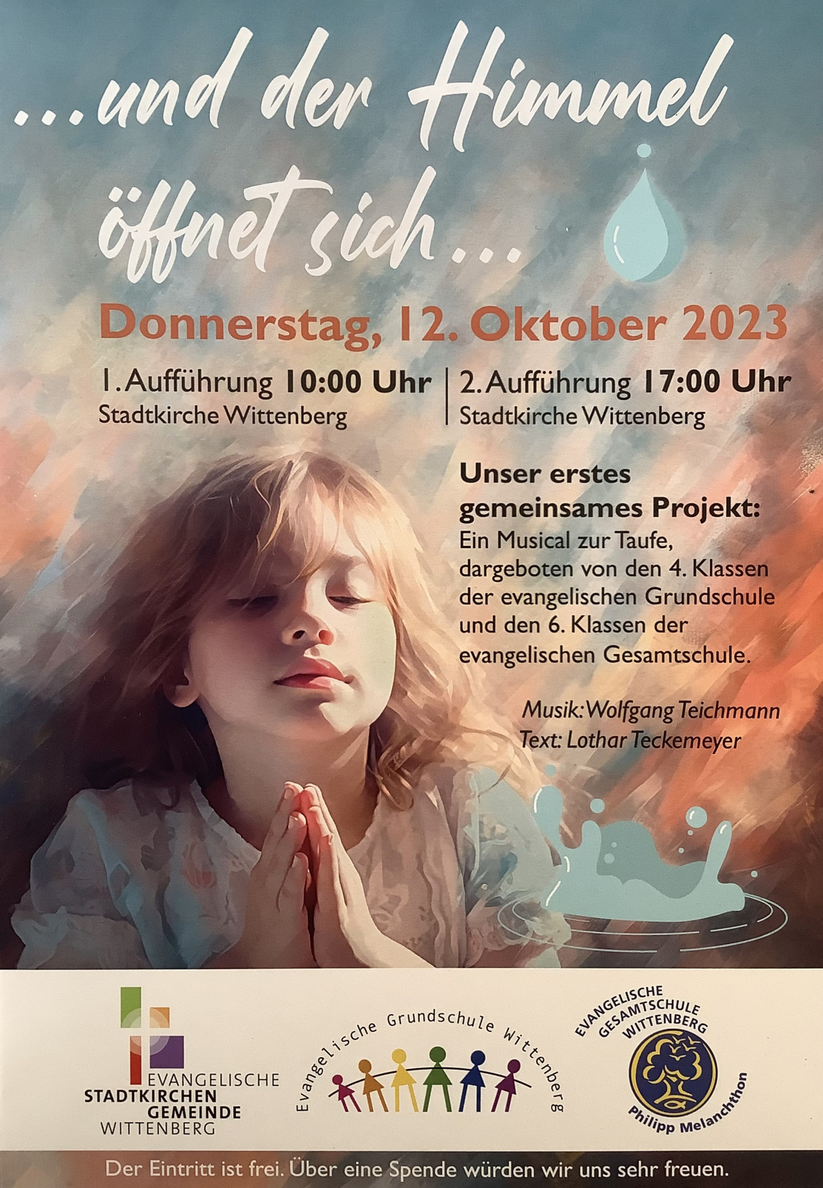 Unsere 4. Klassen sowie die 6. Klassen der Evangelischen Gesamtschule laden Sie, liebe Familien und Freunde, herzlich am 12.10.2023 zum gemeinsamen Musical in die Stadtkirche Wittenberg ein.