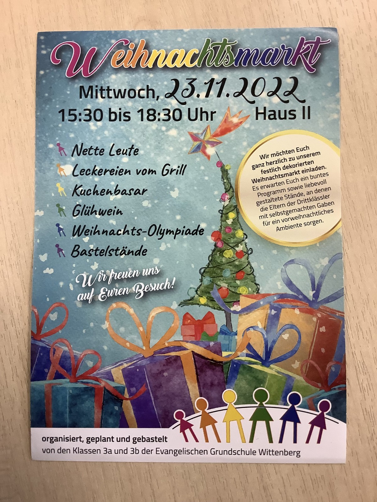Liebe Familien, wir laden Sie recht herzlich zum zweiten Weihnachtsmarkt unserer Schule am 23.11.2022 ab 15.30 Uhr in Haus 2 ein!